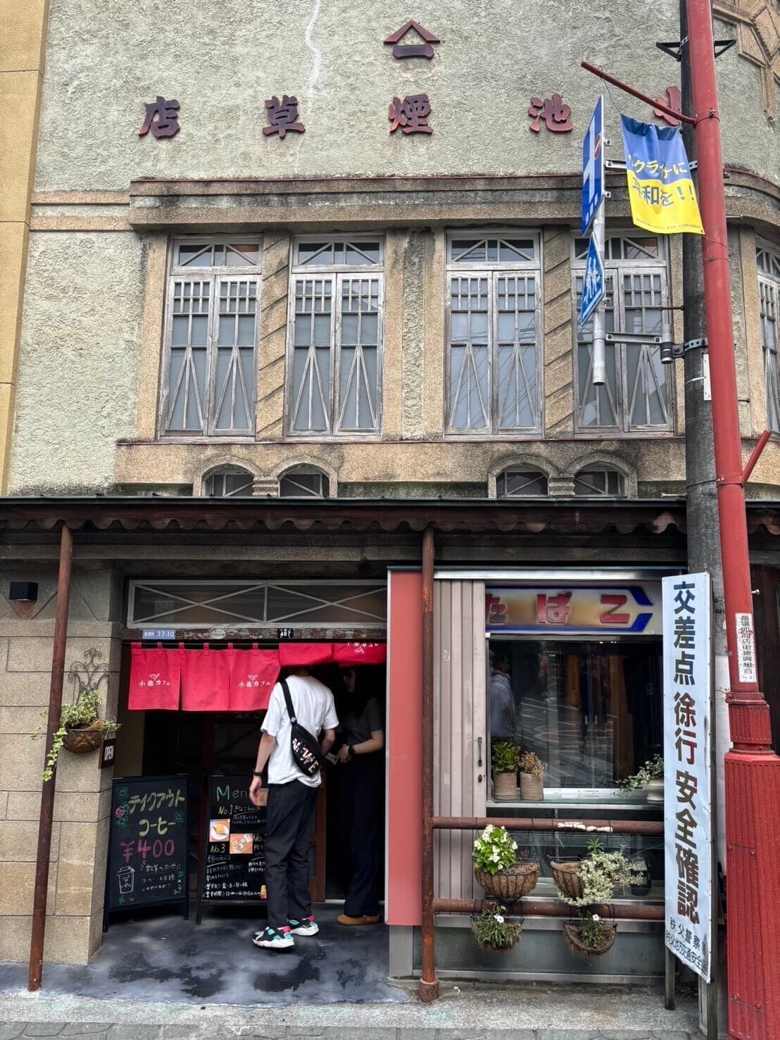 現在はカフェとして営業している「小池煙草店」ファサードサインはうまく撮影できませんでした。角地に建っているのですが、建物の角が丸められています。ヒビを補修したところがタバコの煙のよう。赤い小池カフェの暖簾もかわいいです。