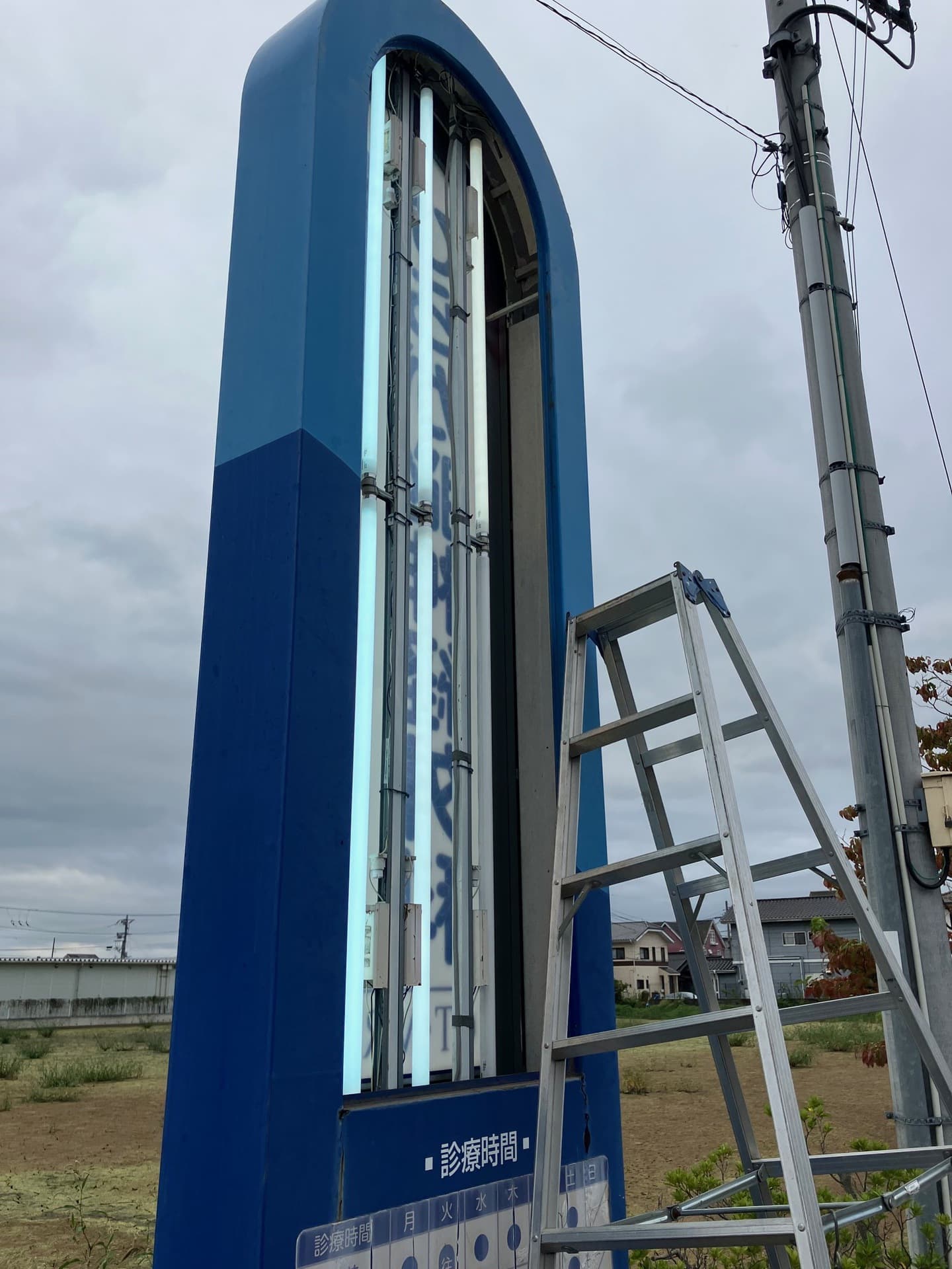 今日は風速4mの中、独立看板の蛍光灯交換をしてきました。まだ、LED化してません。