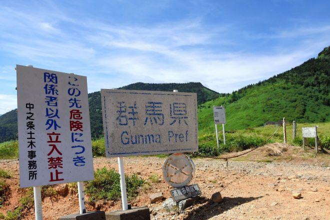 この先に有毒なガスが発生する地帯があり立入禁止にしているそうですが「この先危険につき関係者以外立入禁止」「遭難多発区域」などとされた看板が並んでいることで、まるでこの先の群馬県が遭難多発区域で危険であるかのように読めるとしてネットで度々話題になっています。