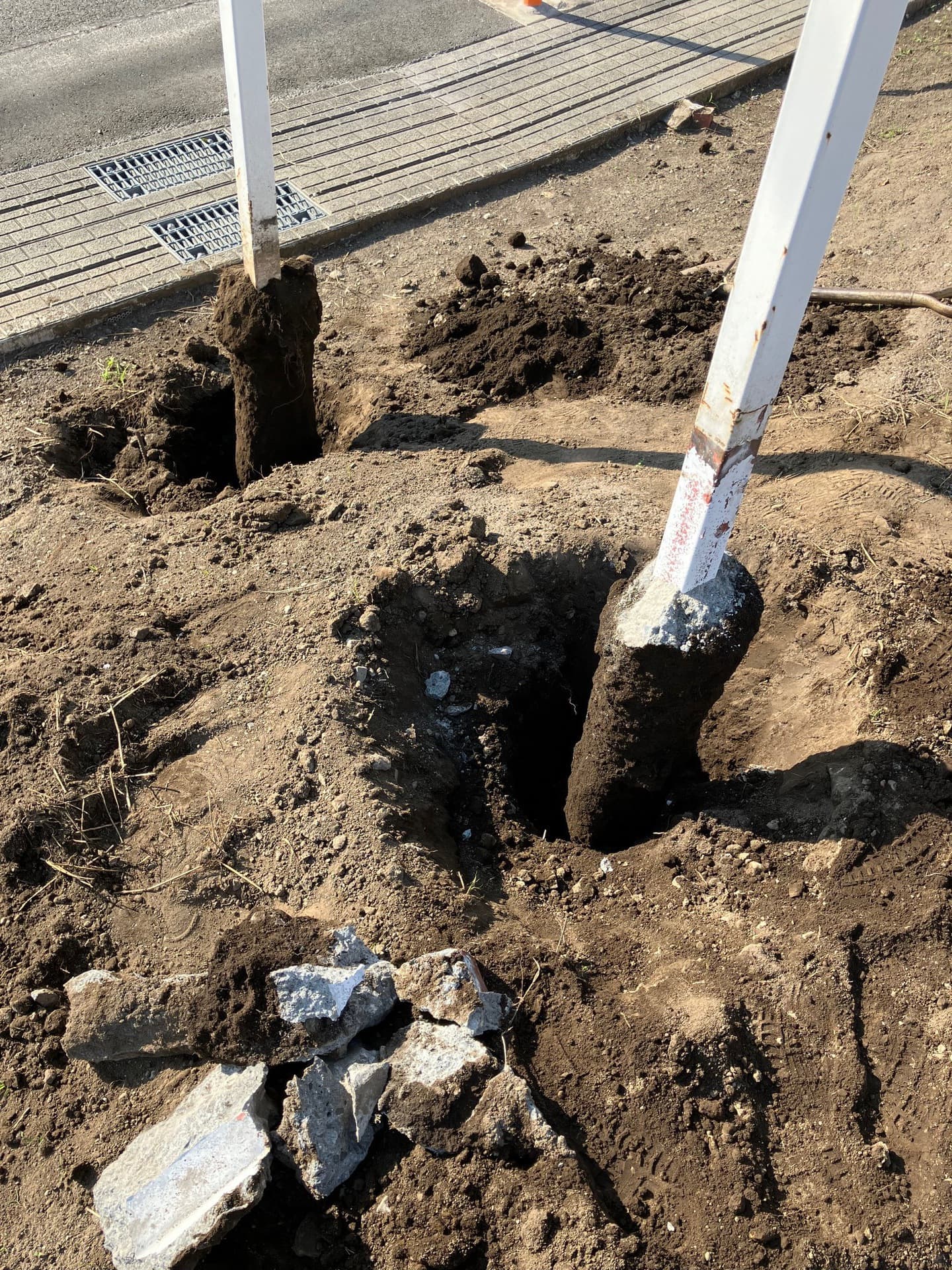 柱のまわりをスコップで掘り、さらに手動穴掘り機で深く土を取り除く。