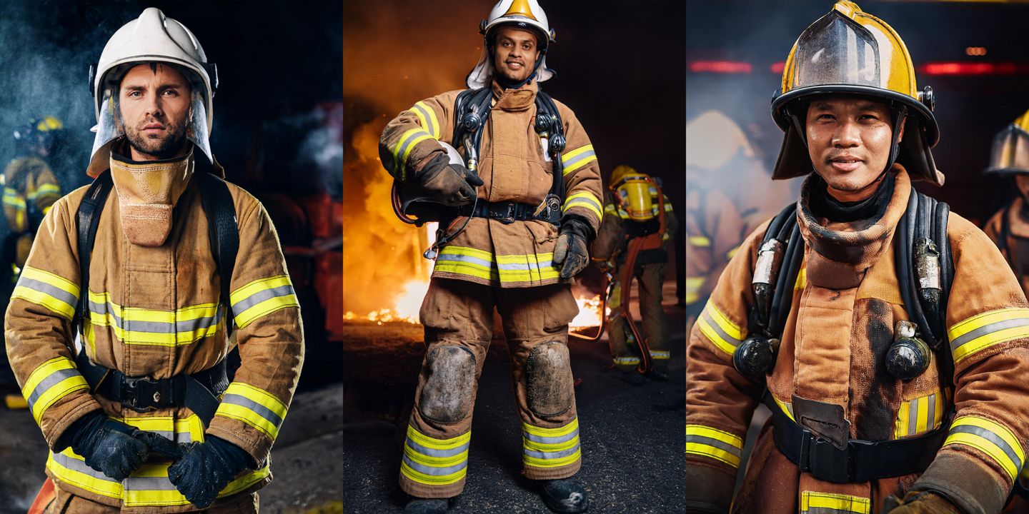仕事柄、日常的にAdobe Photoshop は使いますので、Photoshop 上で画像生成します。「消化活動後の汚れた消防士」を「Dirty firefighters after extinguishing a fire」に一旦翻訳。大半のAIは日本語に対応していますが、英語でプロンプトを書いた方が今の時点では結果は良いです。