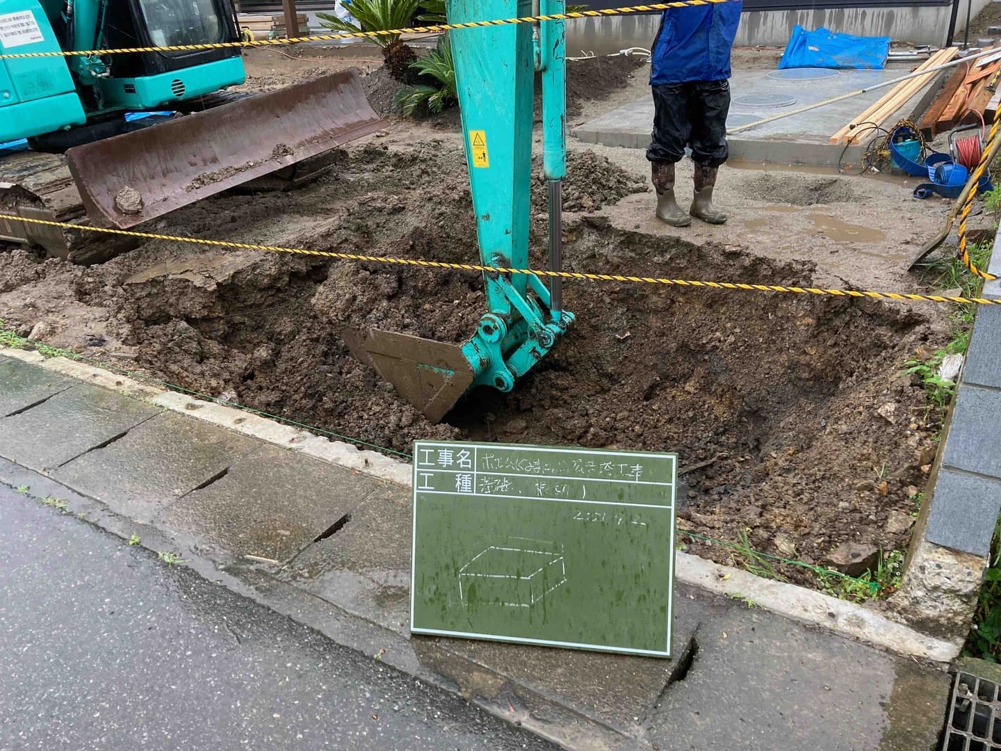 今回、設備屋さんが先に浄化槽を仕込んでしまったので、崩れないように土留めをしながらの作業です。