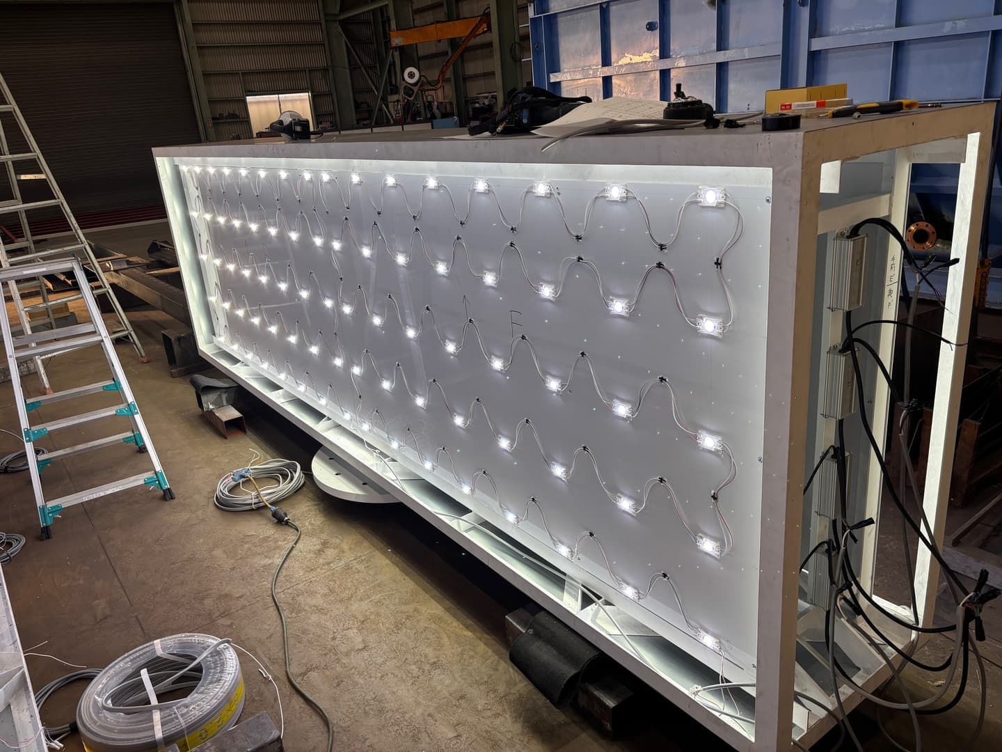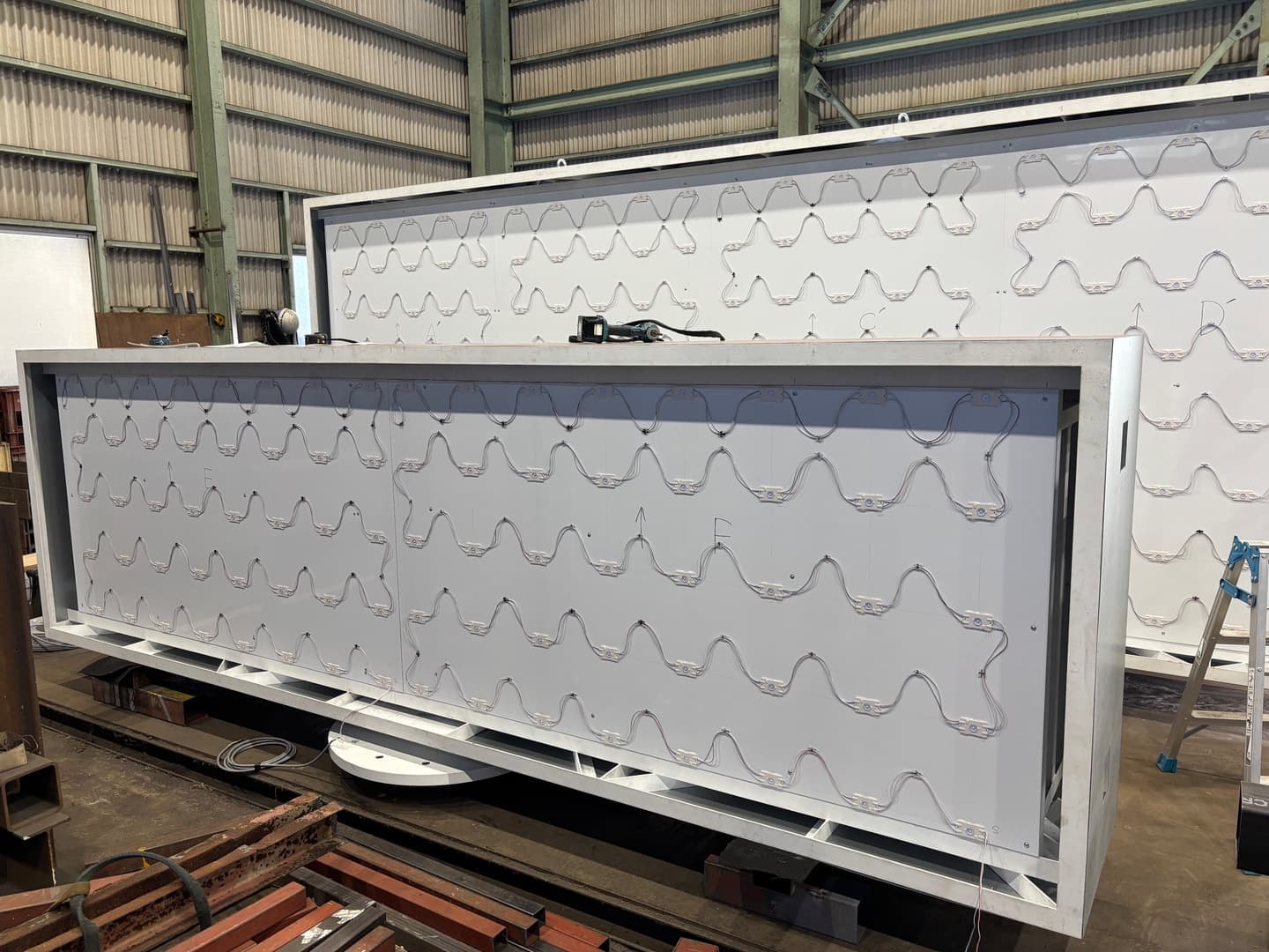 一つ一つ手作業で白い板に貼り付けたLEDを鉄骨で組み上げられた本体に取り付けて