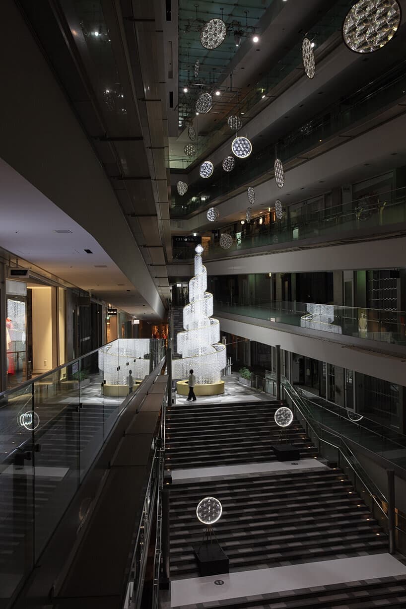 レンズと光の相互作用がツリーに生命を与え、表参道の文化的歴史の真髄をとらえています。オーナメントが建物とその周囲の賑やかな光景を映し出す中、このインスタレーションは訪問者をその空間を探索し、その変化する景色を発見するよう誘います。昼夜を問わず、光のクリスマスツリーはユニークなホリデー スペクタクルを提供します。
