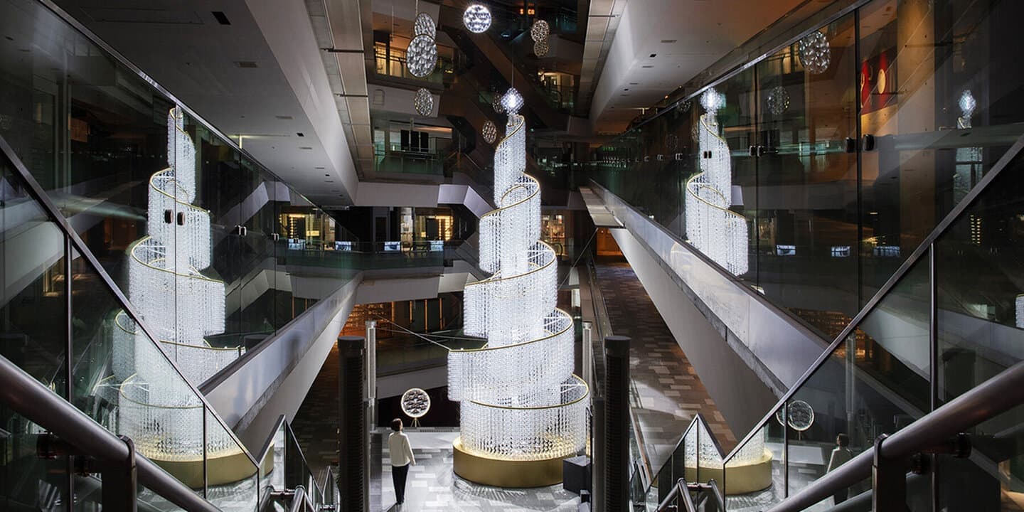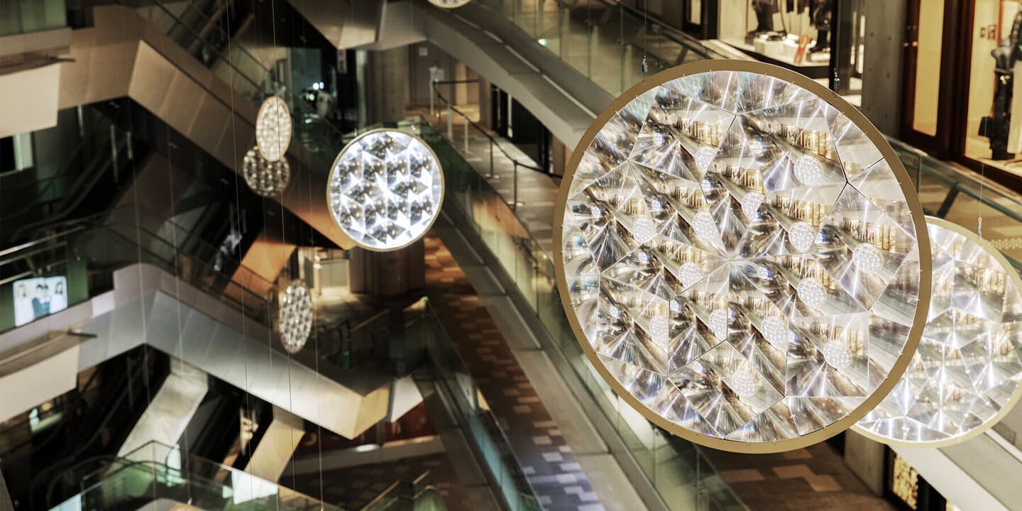 表参道ヒルズのクリスマス2024イベントのためにデザインされた光のクリスマスツリーは、表参道の活気ある文化交流と多様性を反映しています。東京を拠点とするデザイナー、興津裕司氏による中央のインスタレーションを超えて、デザインは万華鏡のような装飾が施されたアトリウムまで広がっています。薄いクリスタルパターンのレンズで作られたこれらの多角形の構造は、ツリーと大階段の上に優雅に浮かんでいます。直径最大90センチメートルのオーナメントは、ツリー、クリスマスの飾り、訪問者の動きを屈折させ、反射を増幅します。その結果、ゲストを多次元の体験に浸らせる万華鏡のような光景が生まれます。