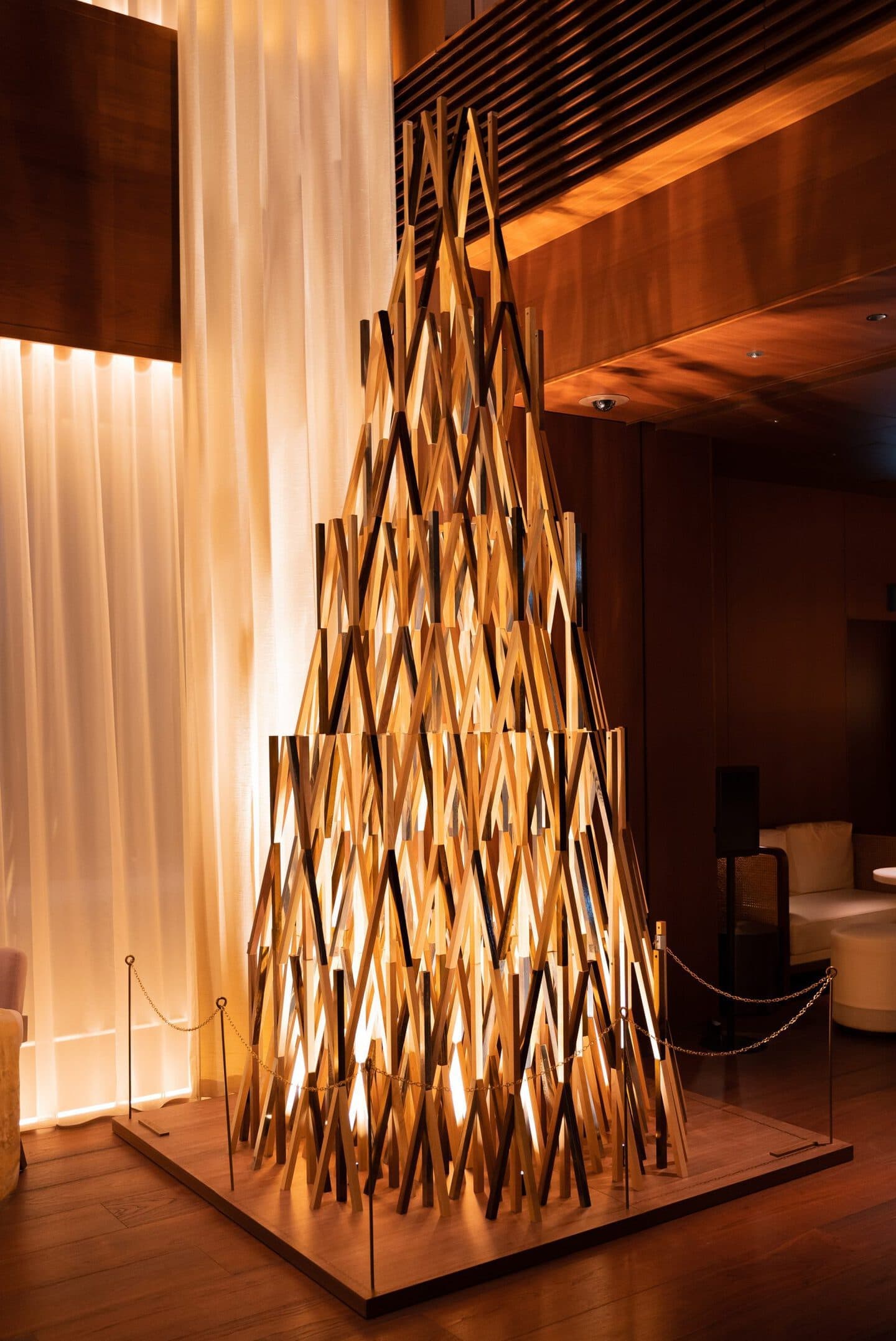 日本の建築家、隈研吾氏は、東京・虎ノ門と銀座のエディションホテルで、家具となる素材で作られたクリスマスツリー2本を公開した。