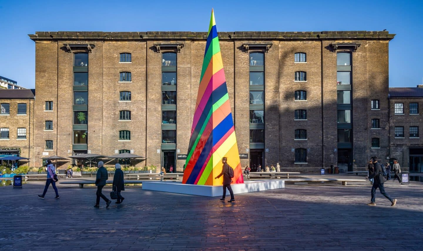 セントラル・セント・マーチンズ大学の前の台座の上に設置された高さ10.7メートルの「蛍光」インスタレーションは、クリスマスツリーの形を再解釈した細長い四面体構造で構成されています。