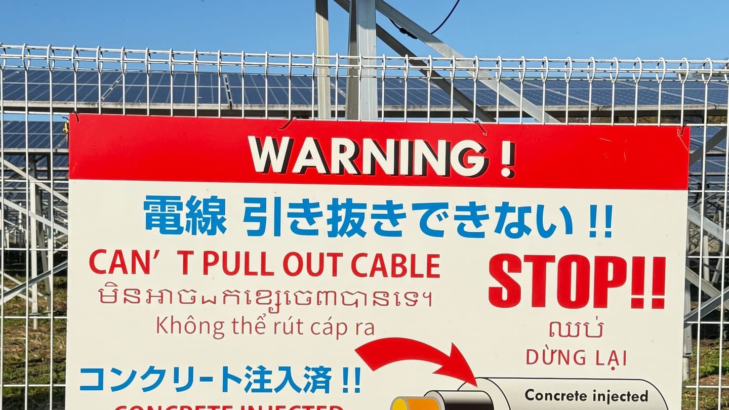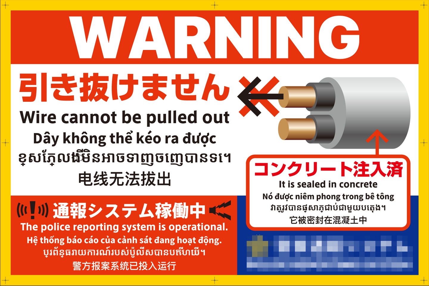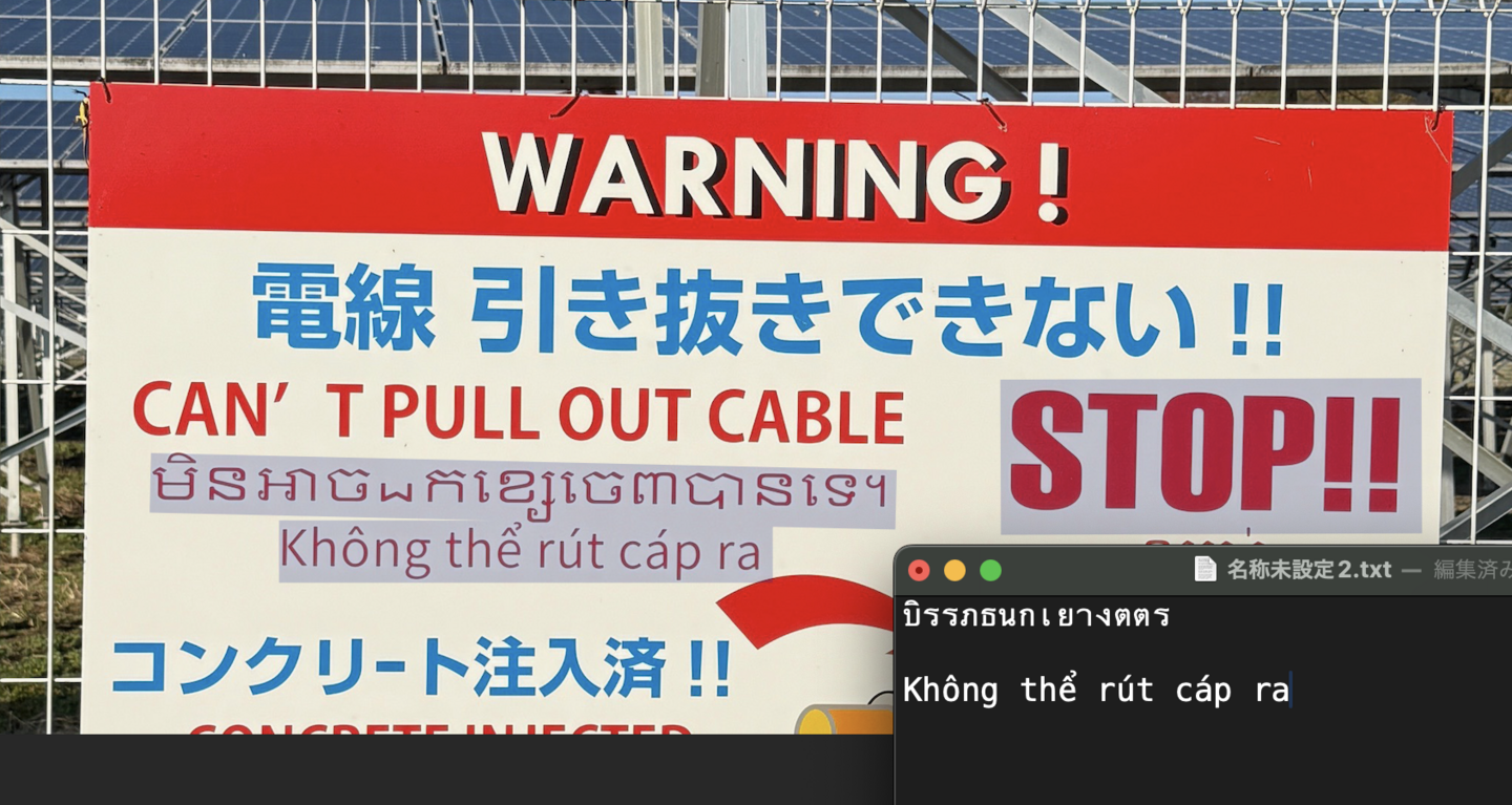 「電源ケーブルは引き抜けません」を「英語」「ベトナム語」「クメール語」「中国語」で用意します。